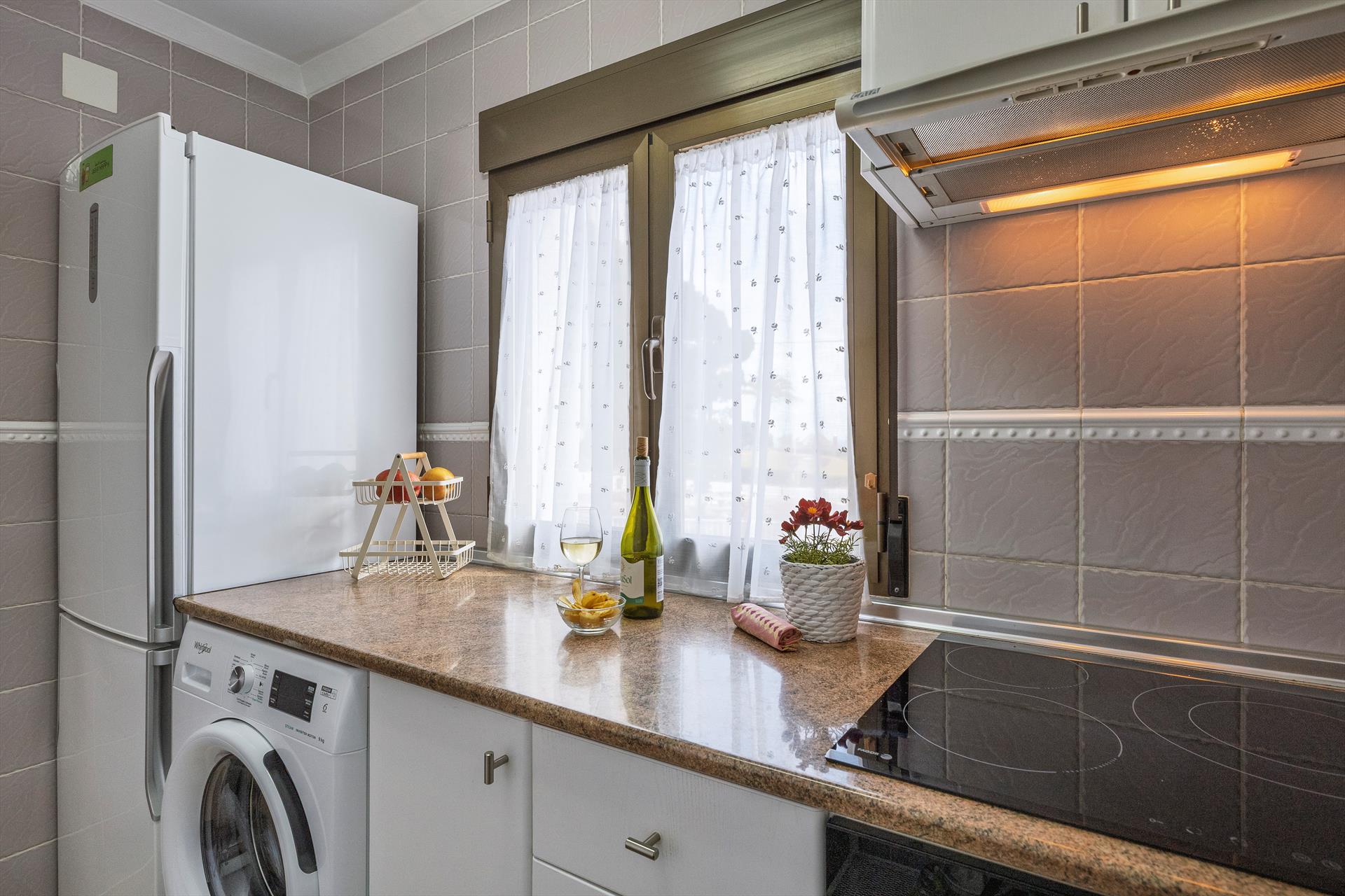 • cocina con placa eléctrica, horno eléctrico, microondas, frigorífico-congelador, cafetera y tostadora