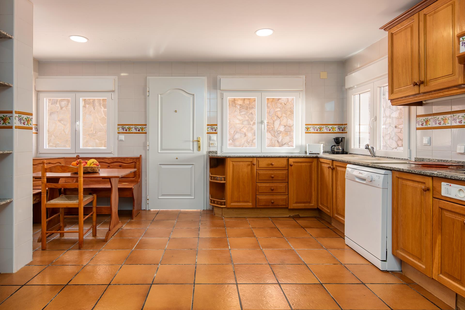 Interior: Frigorífico, encimera y horno o grill eléctrico, cafetera, tostadora, hervidor de agua, plancha y tabla de planchar, batidora.