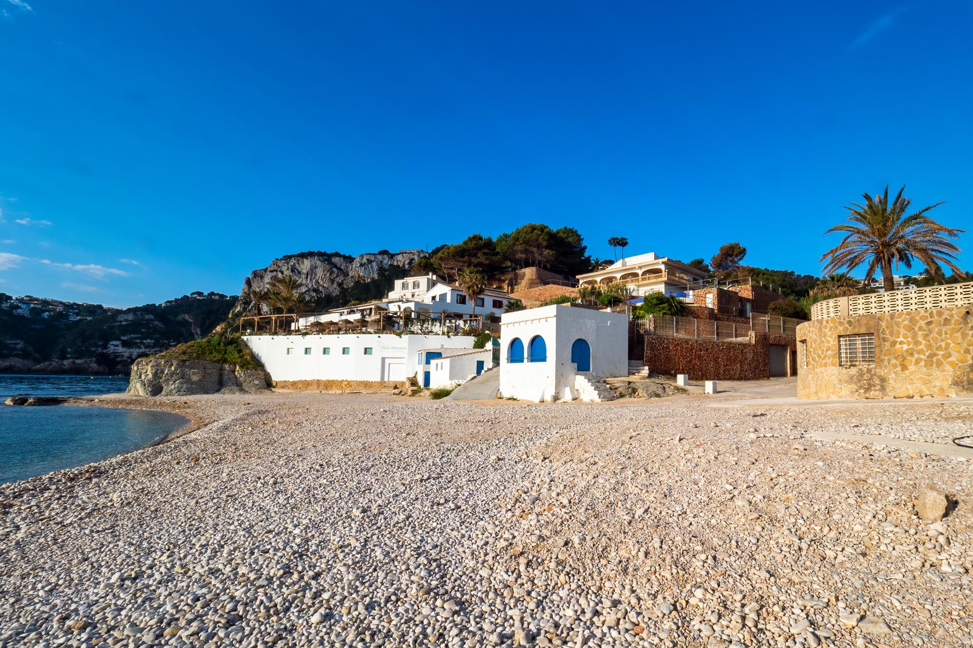 La clásica y espaciosa villa se encuentra en la playa rocosa de La Barraca en Jávea, en segunda fila, uno de los mejores lugares para irse de vacaciones, rodeado de naturaleza, colinas, pinos, y los sonidos del mar. La Bahía del Portixol es una reserva natural conocida y muy popular entre los buceadores. La playa de La Barraca está compuesta principalmente por piedras de tamaño mediano, mezcladas con arena y rocas en el último extremo. Esta playa es muy popular entre los buceadores y los deportes acuáticos y durante muchos años fue poco conocida. Hoy en día, la playa es mucho más conocida, también gracias al conocido beach bar y Restaurante Cala Clemence. En verano se alquilan canoas y piraguas. El supermercado más cercano está a unos 5 minutos en coche, igual que diversas tiendas y posibilidades de comprar. La playa de arena El Arenal, el puerto y el casco antiguo están a unos 10 minutos en coche. Se recomienda disponer de coche durante la estancia para este alojamiento.