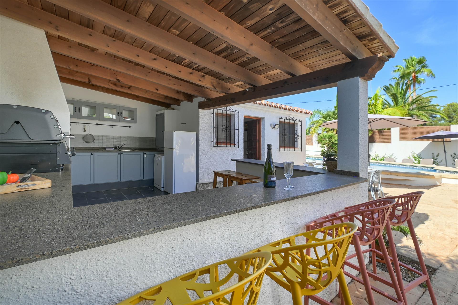 Maravillosa y confortable villa con piscina privada en Jávea, Costa Blanca, España para 10 personas. La casa está situada en una zona residencial de playa y a 3 km de la Cala de la Barraca, playa de Jávea.