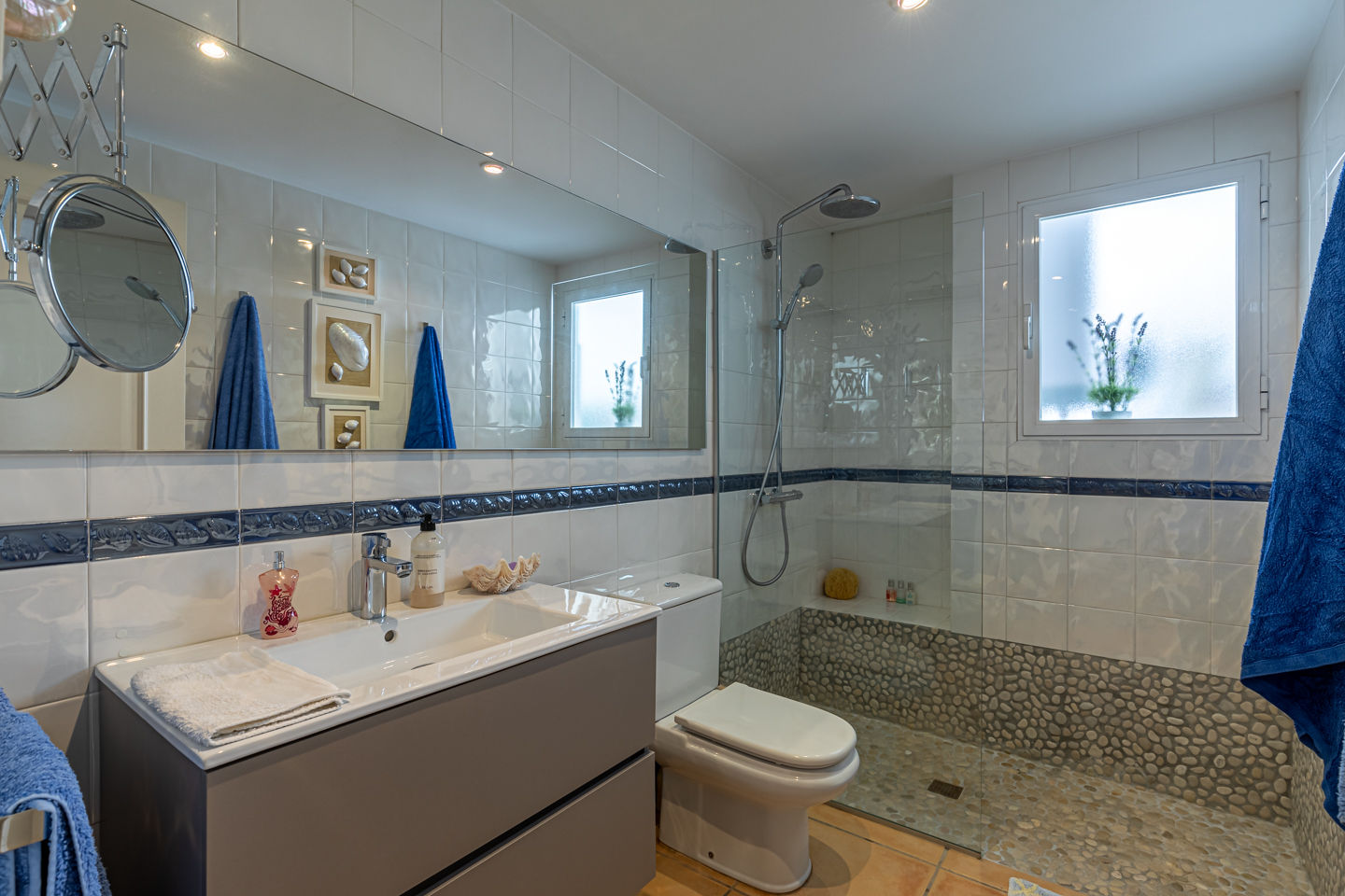 • Badezimmer mit Einzelwaschbecken, Dusche, Toilette und Haartrockner