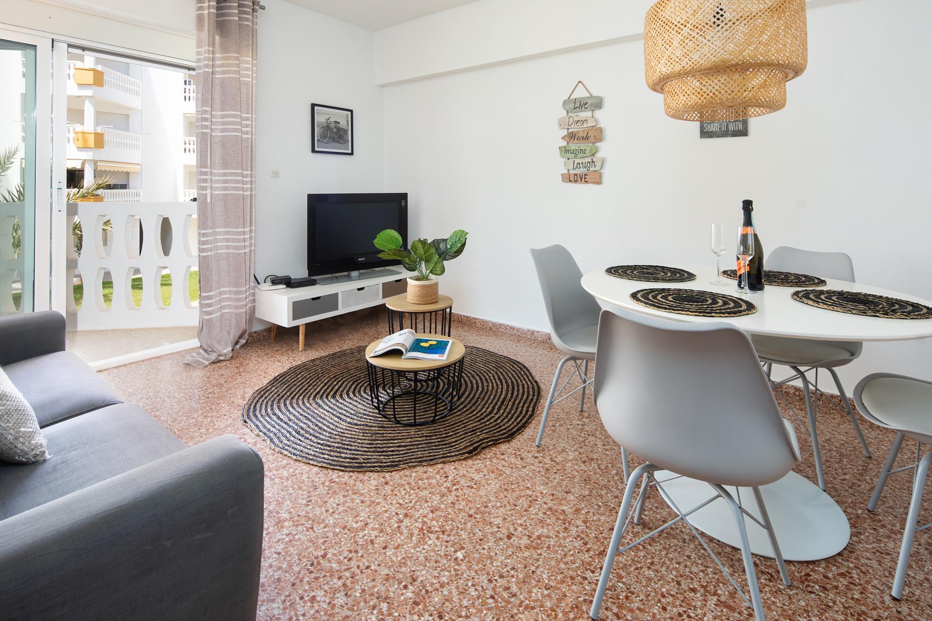 • Wohn-/Esszimmer mit Smart-TV, mit spanischen Kanälen und Zugang zur Terrasse mit Blick auf den Pool und den Garten