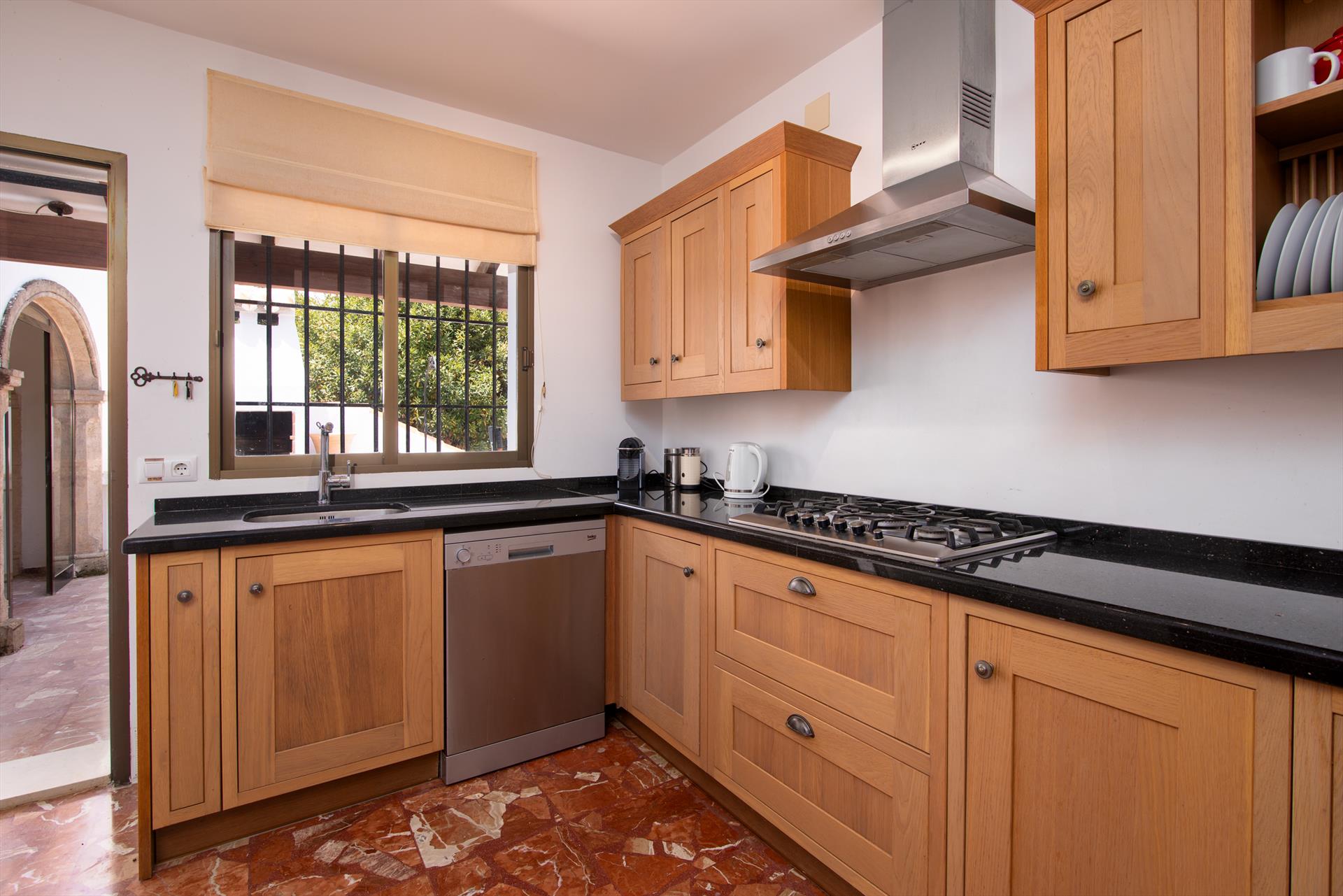• grosse, moderne Küche mit Grill/Mikrowelle, separatem Backofen, Geschirrspülmaschine und Zugang zur Terrasse mit Grill