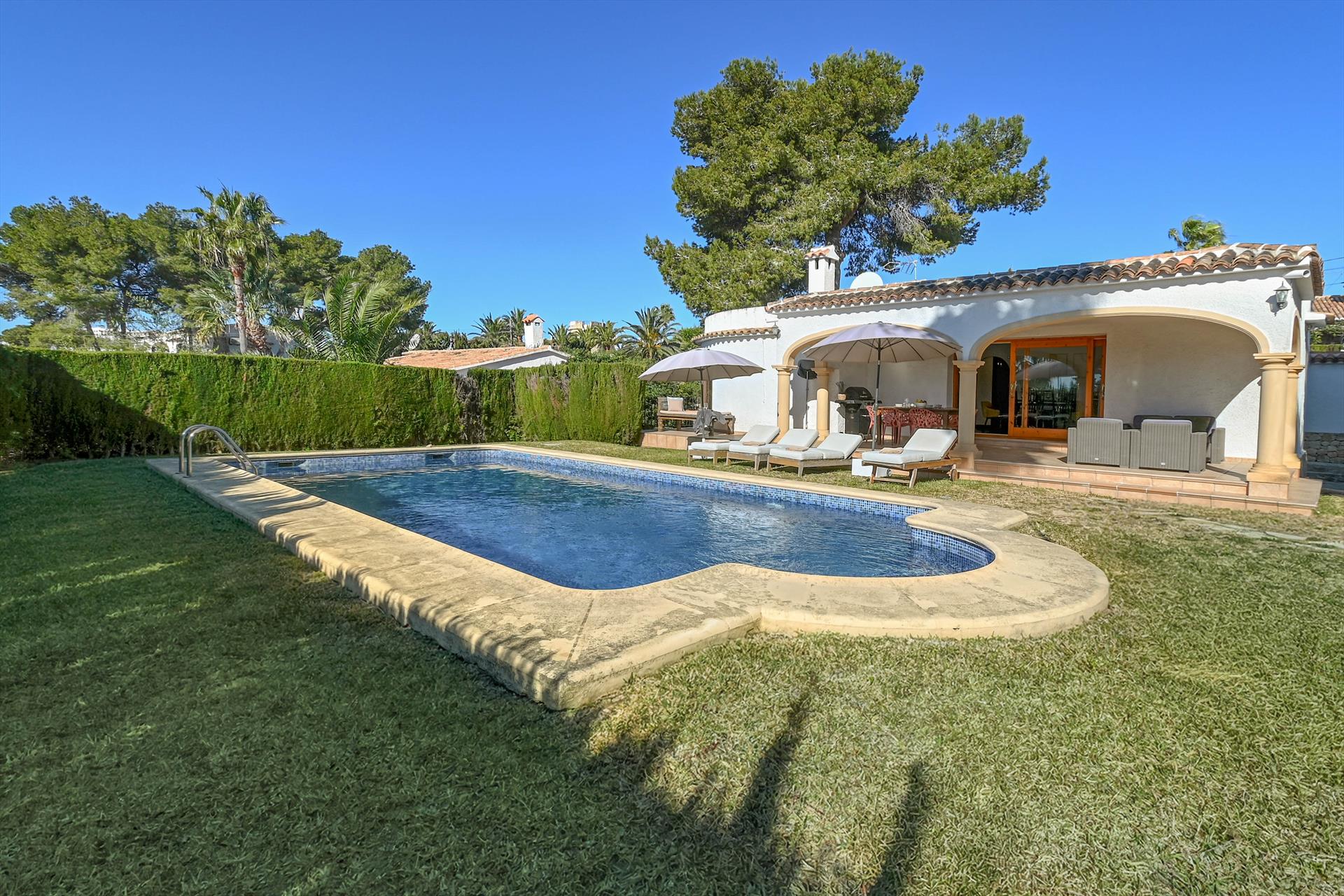 Schöne und komfortable Villa in Javea, Costa Blanca, Spanien, mit privatem Pool für 4 Personen. Das Haus befindet sich in einer Küsten-, hügeligen, bewaldeten und Wohngegend, in der Nähe von Restaurants und Bars, Supermärkten und einem Tennisplatz und ist 2 km vom Playa Ambolo, Javea Strand entfernt.