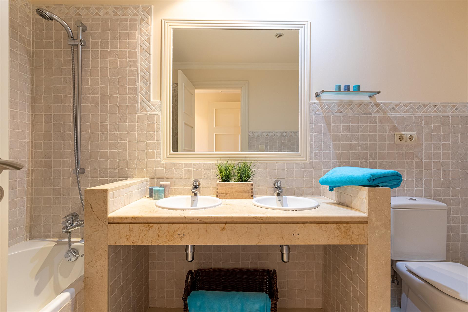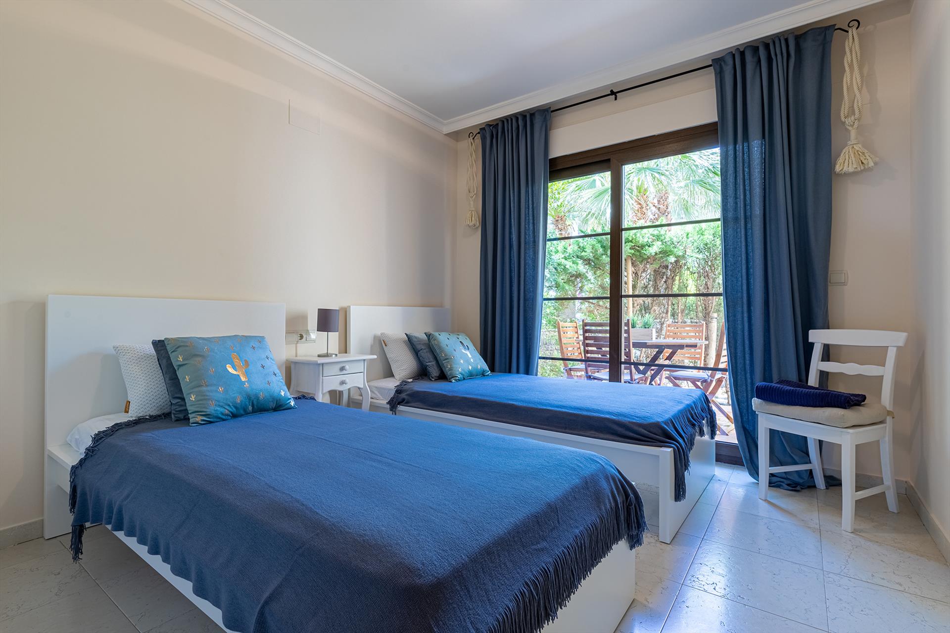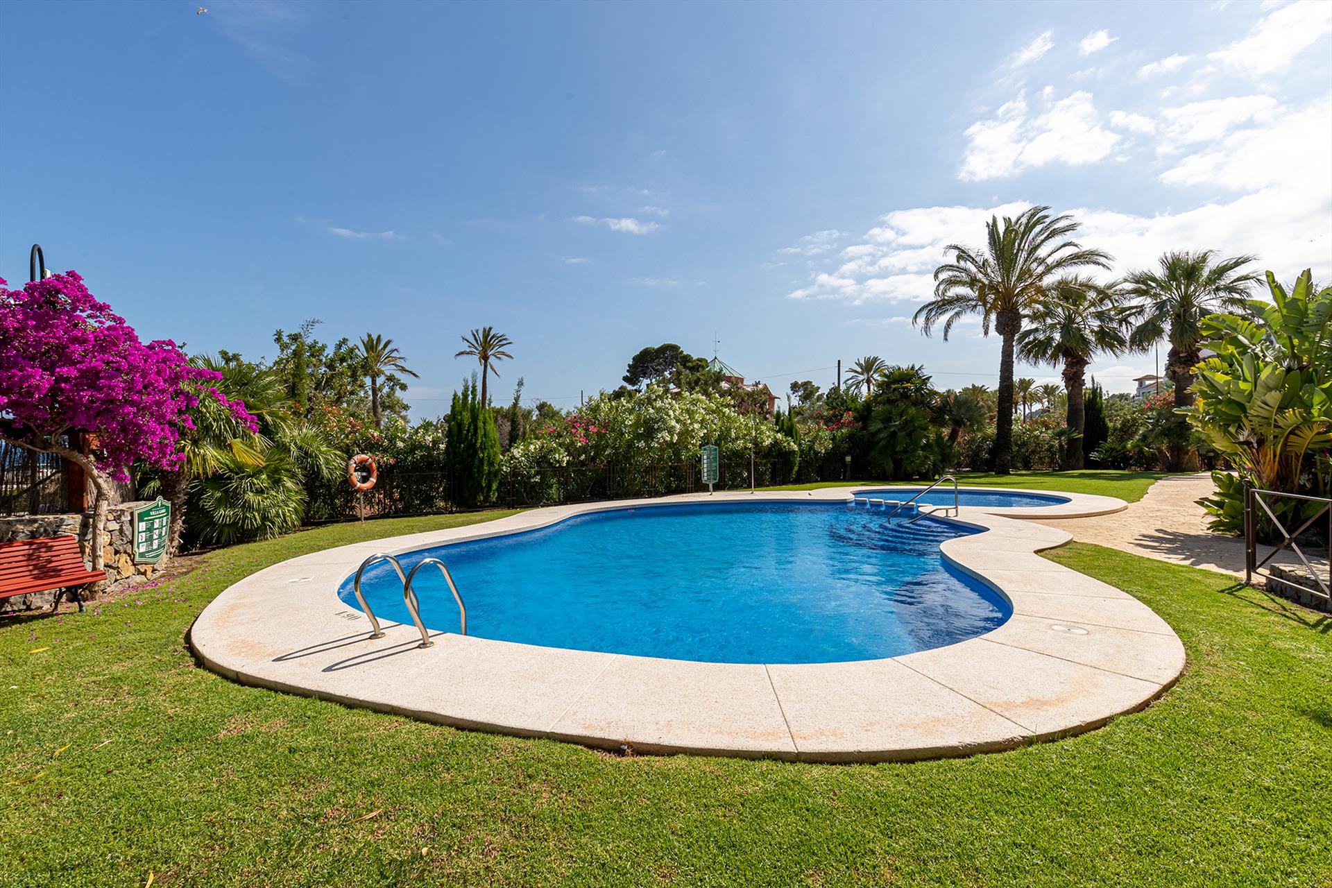 The apartment has 2 bedrooms and 2 bathrooms. The accommodation offers privacy, a beautiful lawned garden, a communal garden with trees, and beautiful views of the bay, the sea, the garden, and other buildings. Its comfort and the proximity to the beach, places to shop, sports activities, entertainment facilities, and places to go out make this an ideal apartment to spend your holidays in Spain with family or friends.