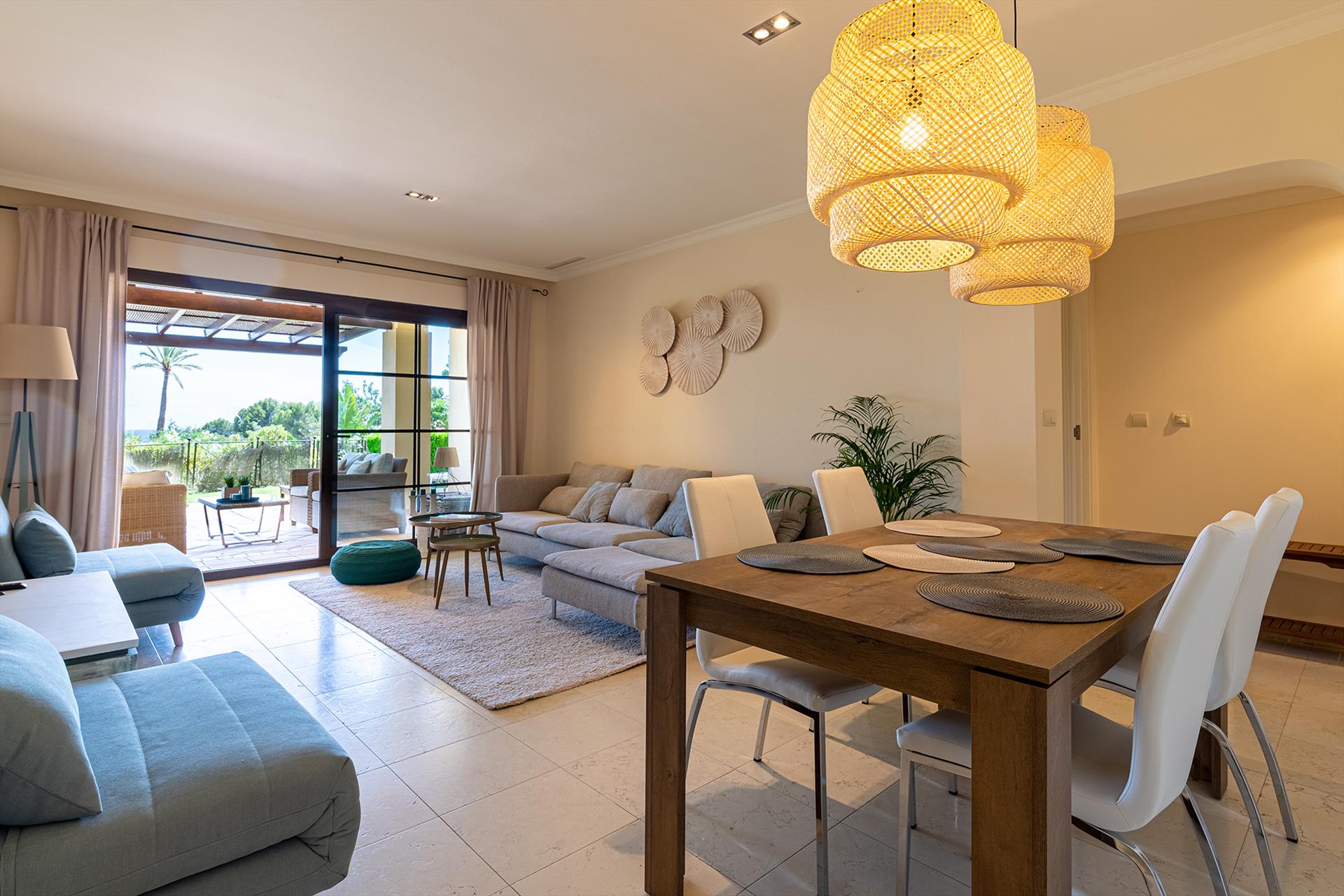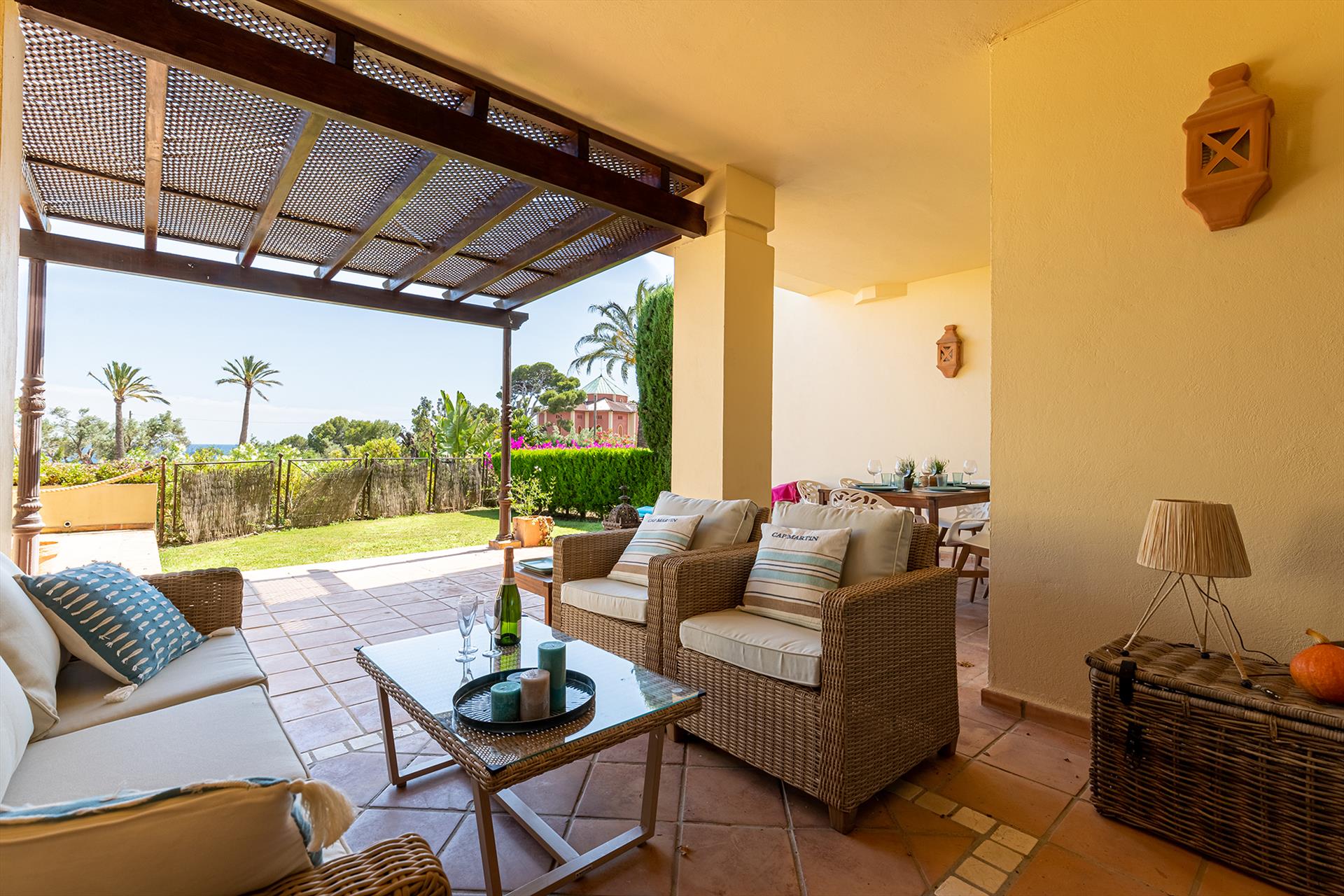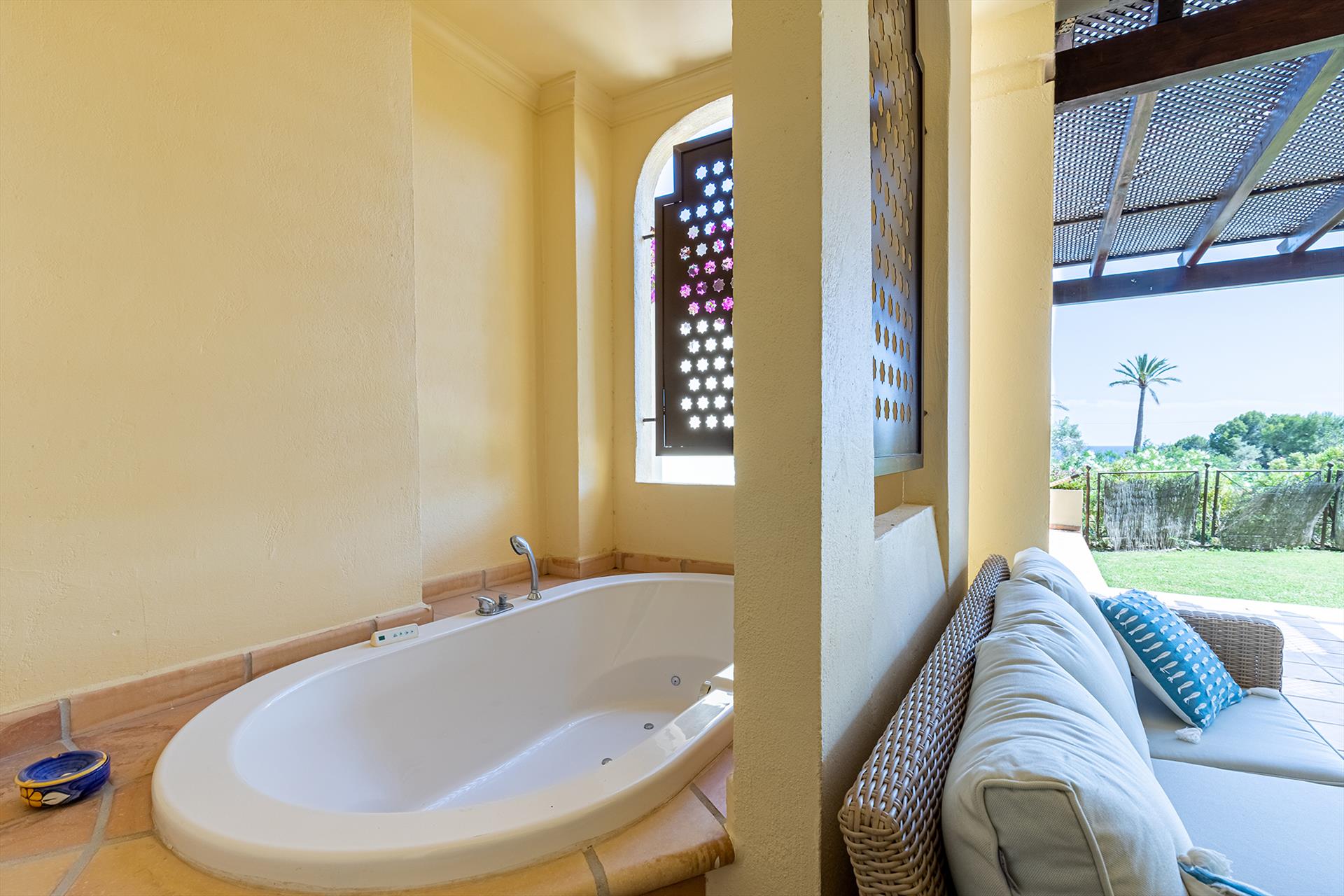 The apartment has 2 bedrooms and 2 bathrooms. The accommodation offers privacy, a beautiful lawned garden, a communal garden with trees, and beautiful views of the bay, the sea, the garden, and other buildings. Its comfort and the proximity to the beach, places to shop, sports activities, entertainment facilities, and places to go out make this an ideal apartment to spend your holidays in Spain with family or friends.