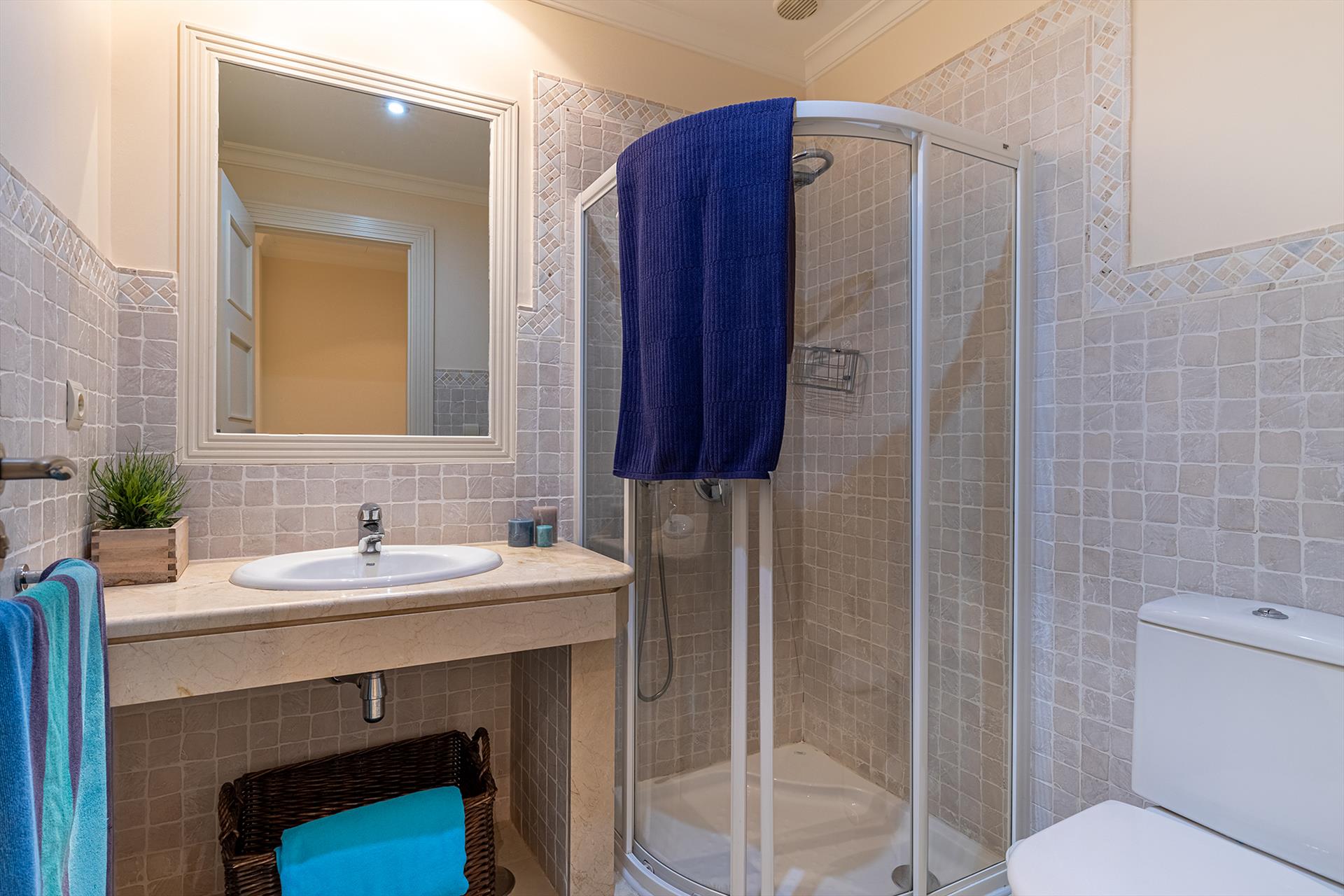 • en-suite bathroom with single washbasin, shower, and toilet