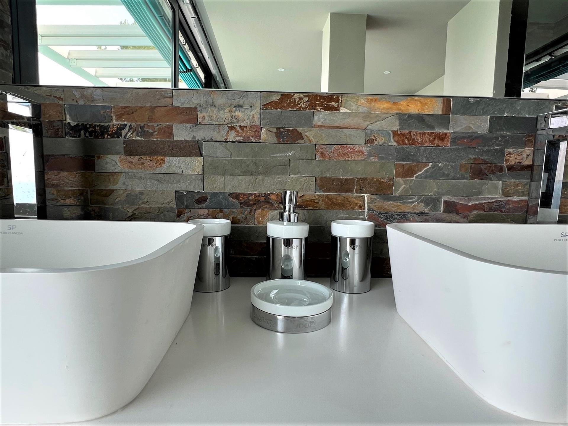 • bathroom with double washbasin, shower and toilet