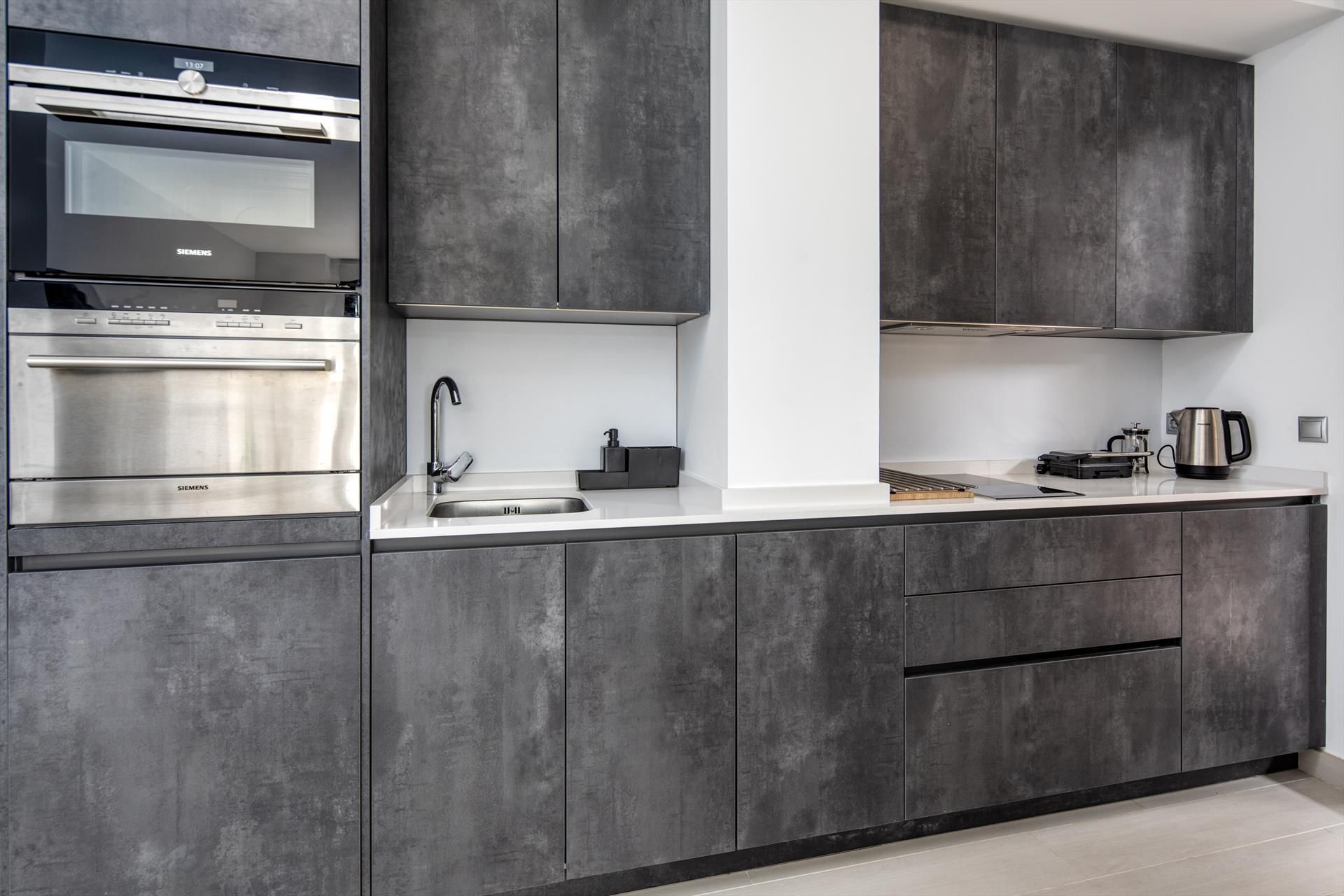 • Open kitchen with modern appliances, including small dishwasher, washer/dryer, microwave, Nespresso coffe machine