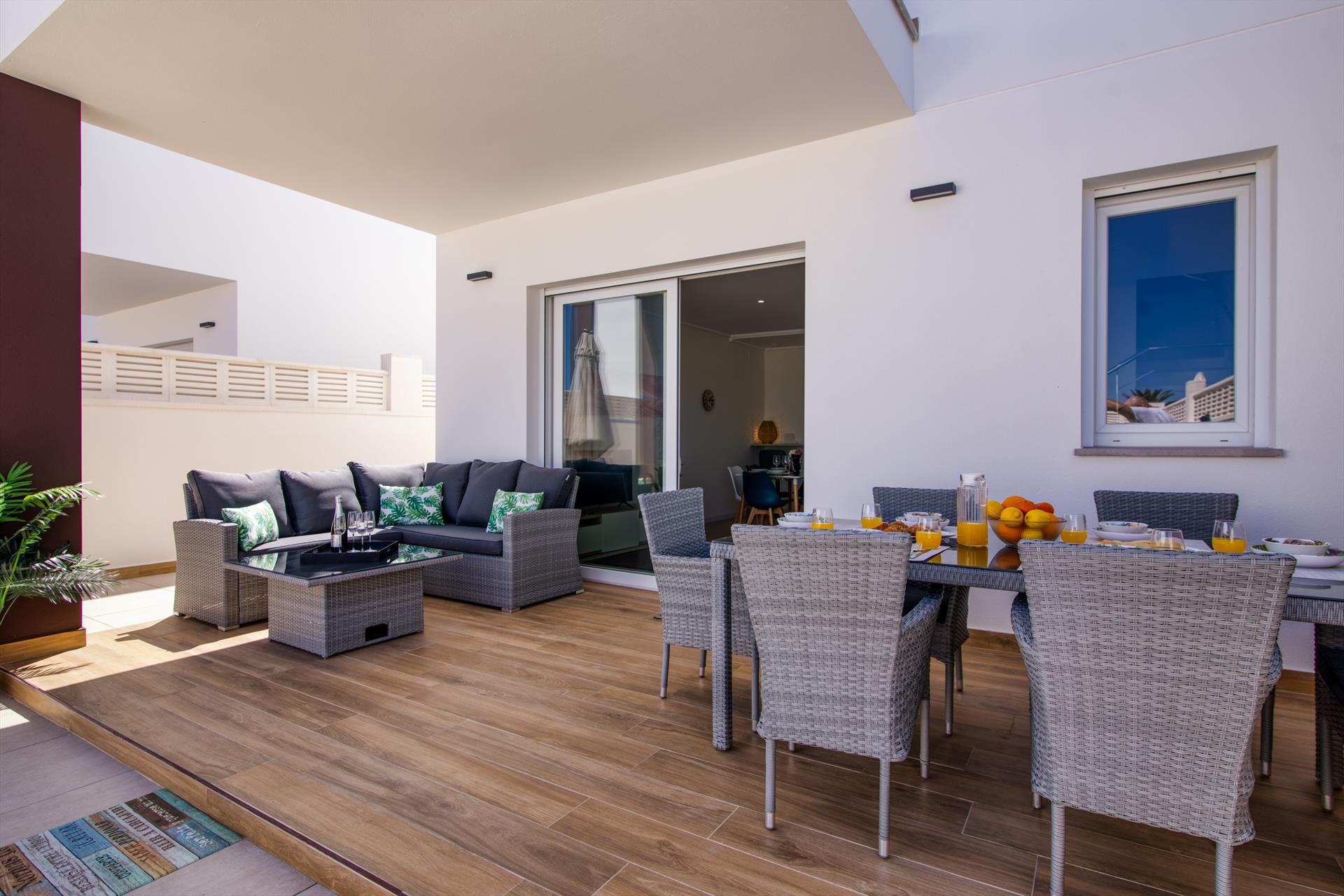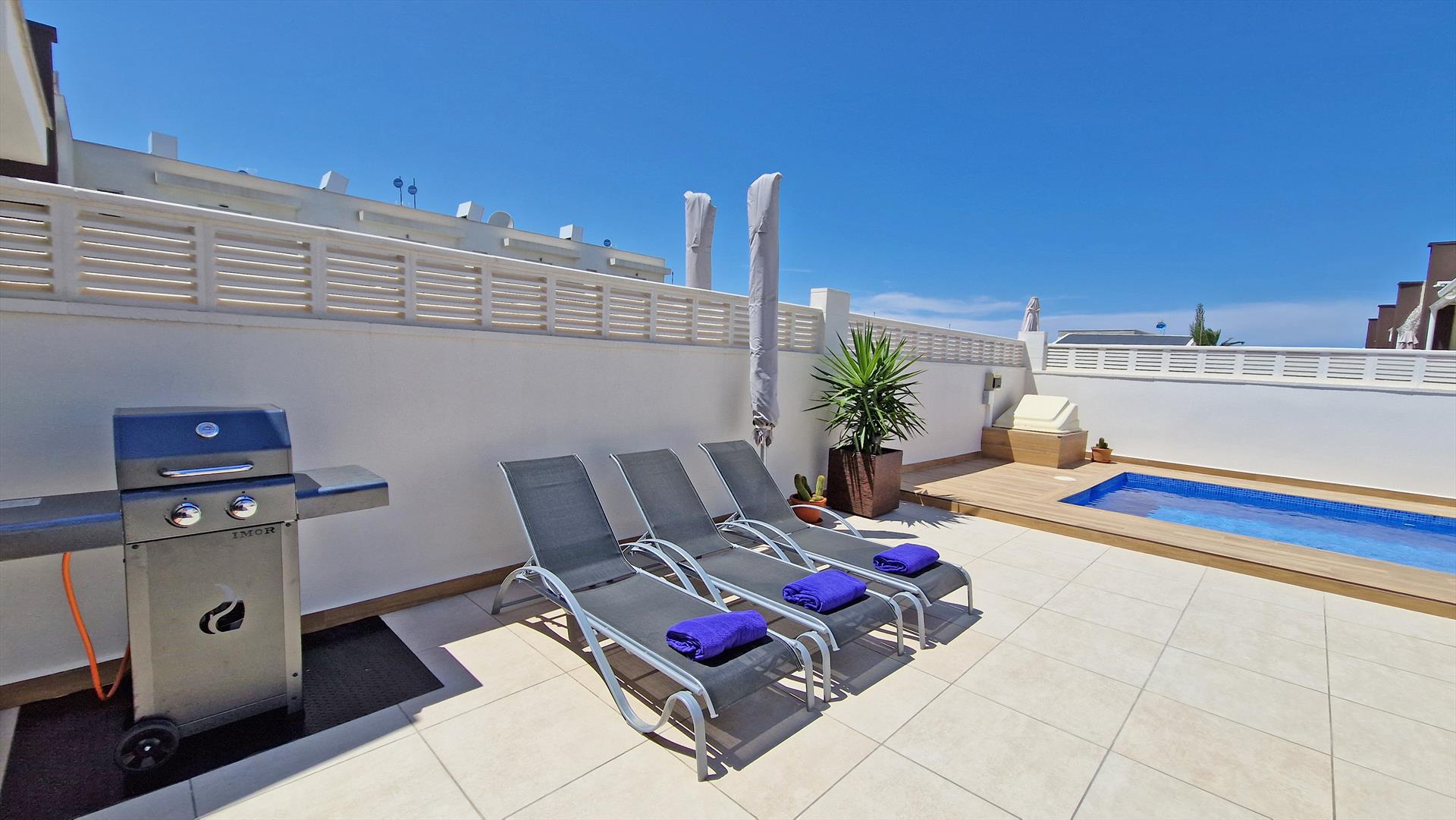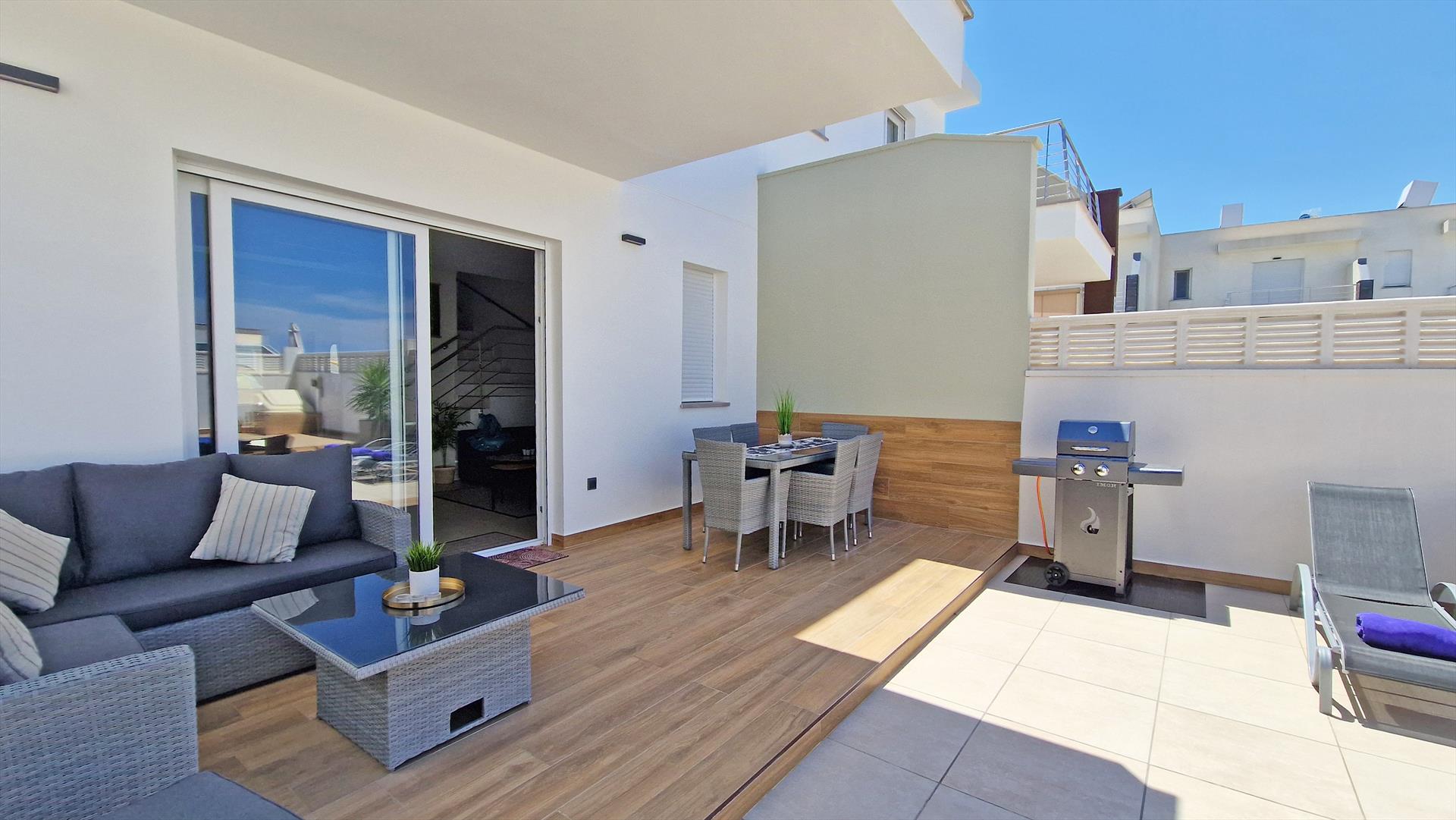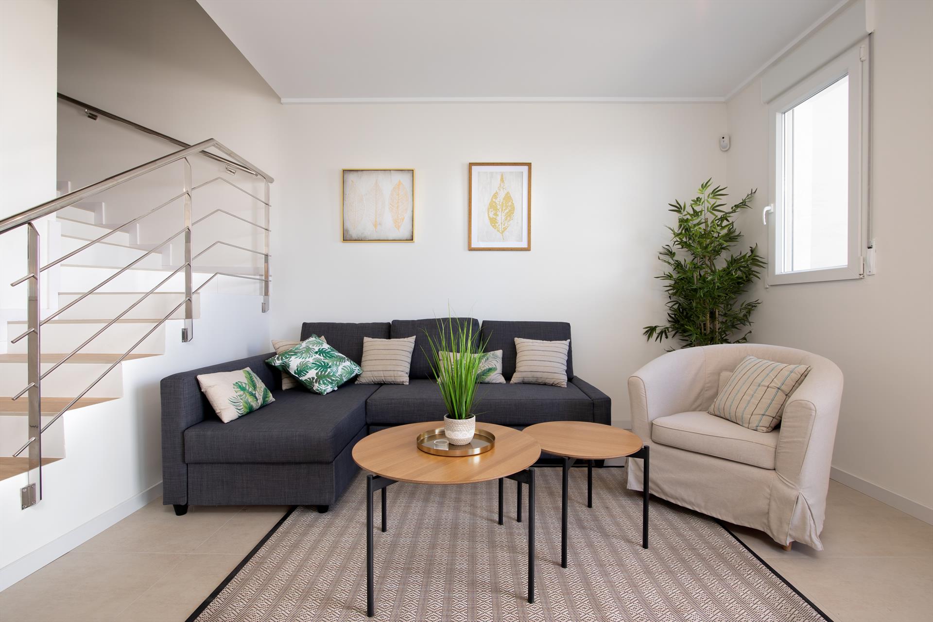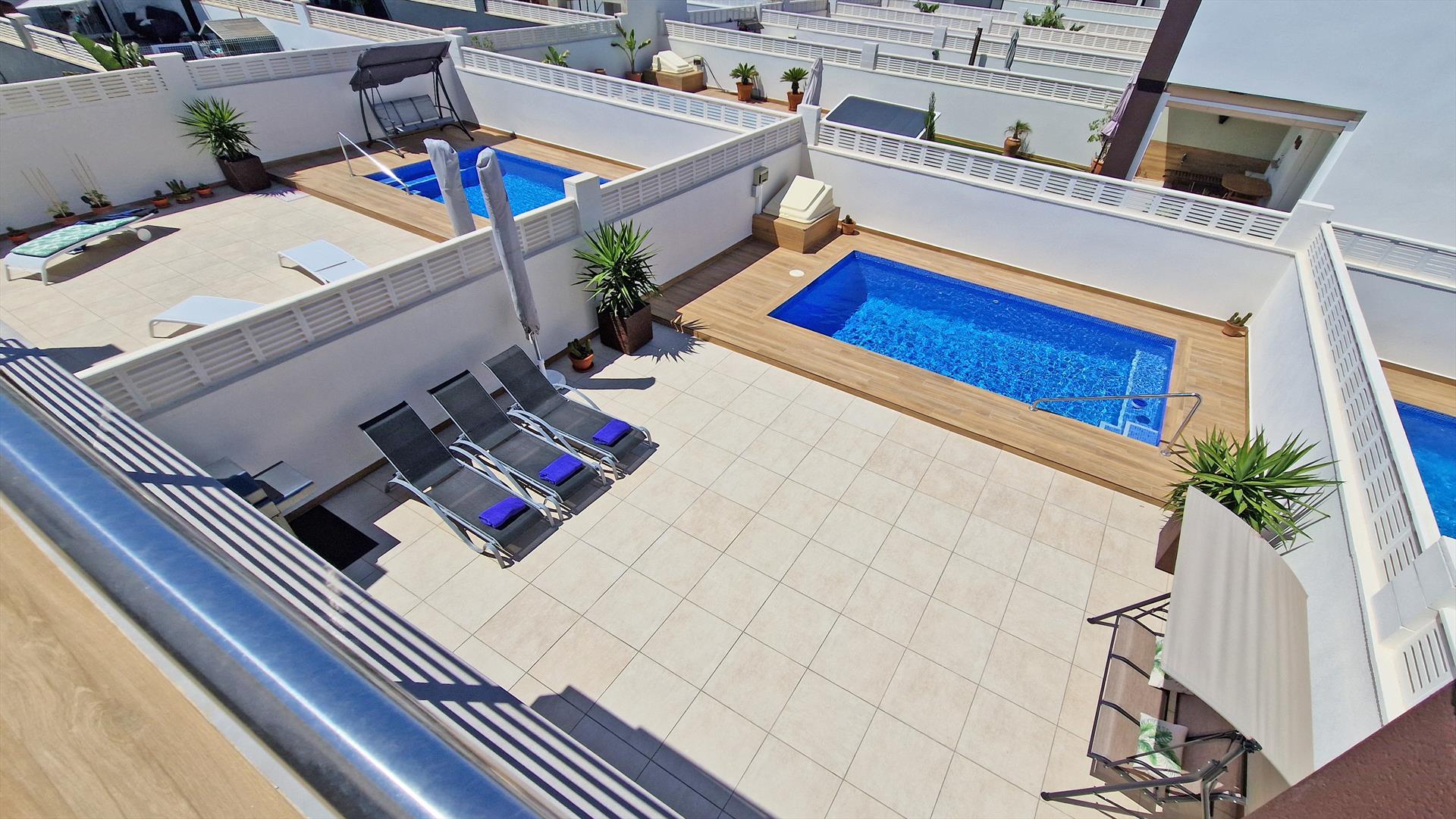 The 2-storey semi-detached house has been tastefully furnished and offers a nice ambience. A private terrace, partially covered, offers an outdoor dining area, a cozy sofa corner and a private pool. On the lower floor is the living area with modern kitchen and guest toilet and on the upper floor there are 3 bedrooms and 2 bathrooms. The house offers central air conditioning and free Wifi on both floors.