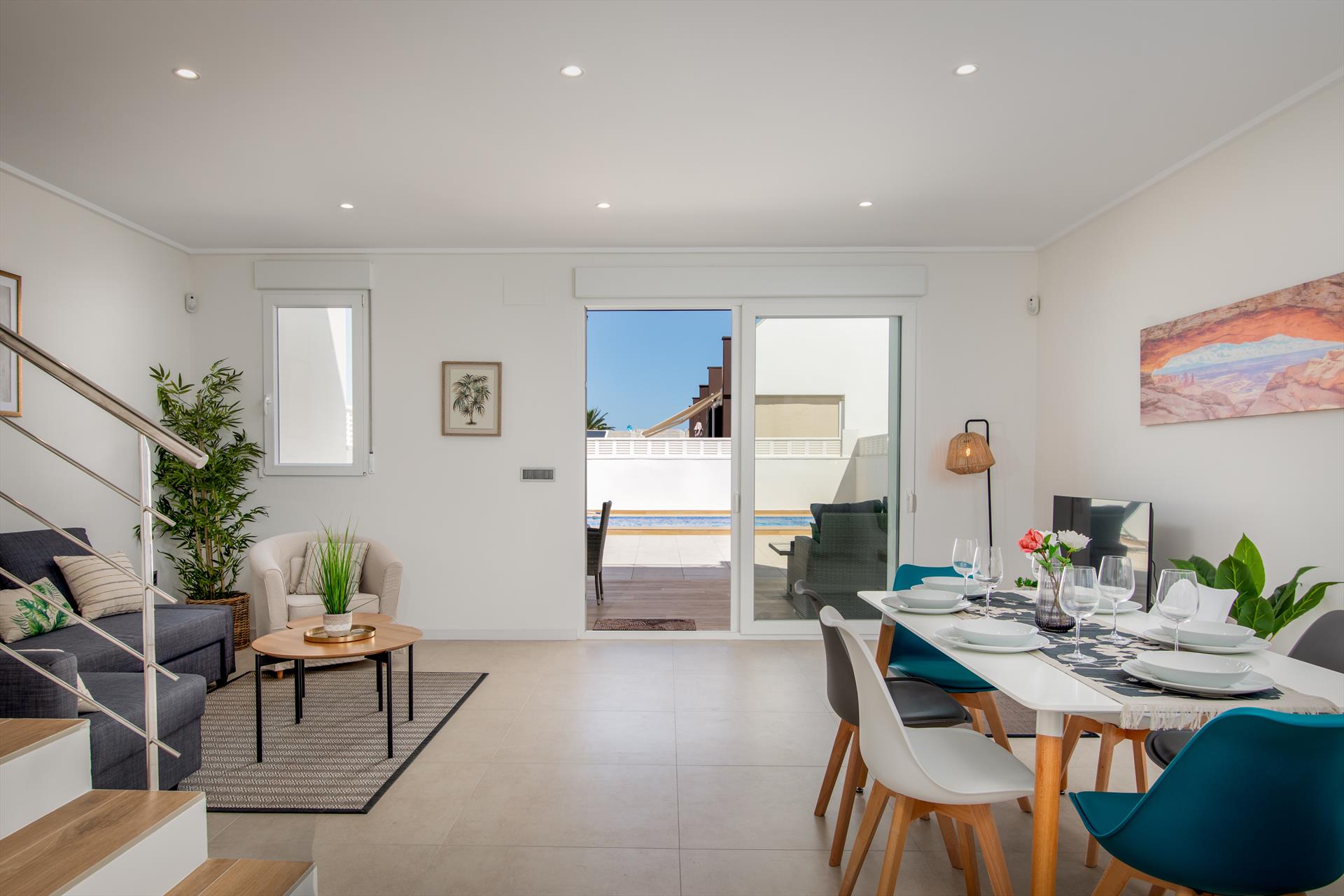 Modern and nice holiday home in Denia, El Vergel, Costa Blanca, Spain with private pool for 4-6 persons (maximum 4 adults and 2 children). The newly built terraced house on 2 floors is located at the entrance to El Vergel, in the immediate vicinity of various shops, a supermarket and only 5 minutes by car from the sandy beach of Deveses or the Almadrava beach.