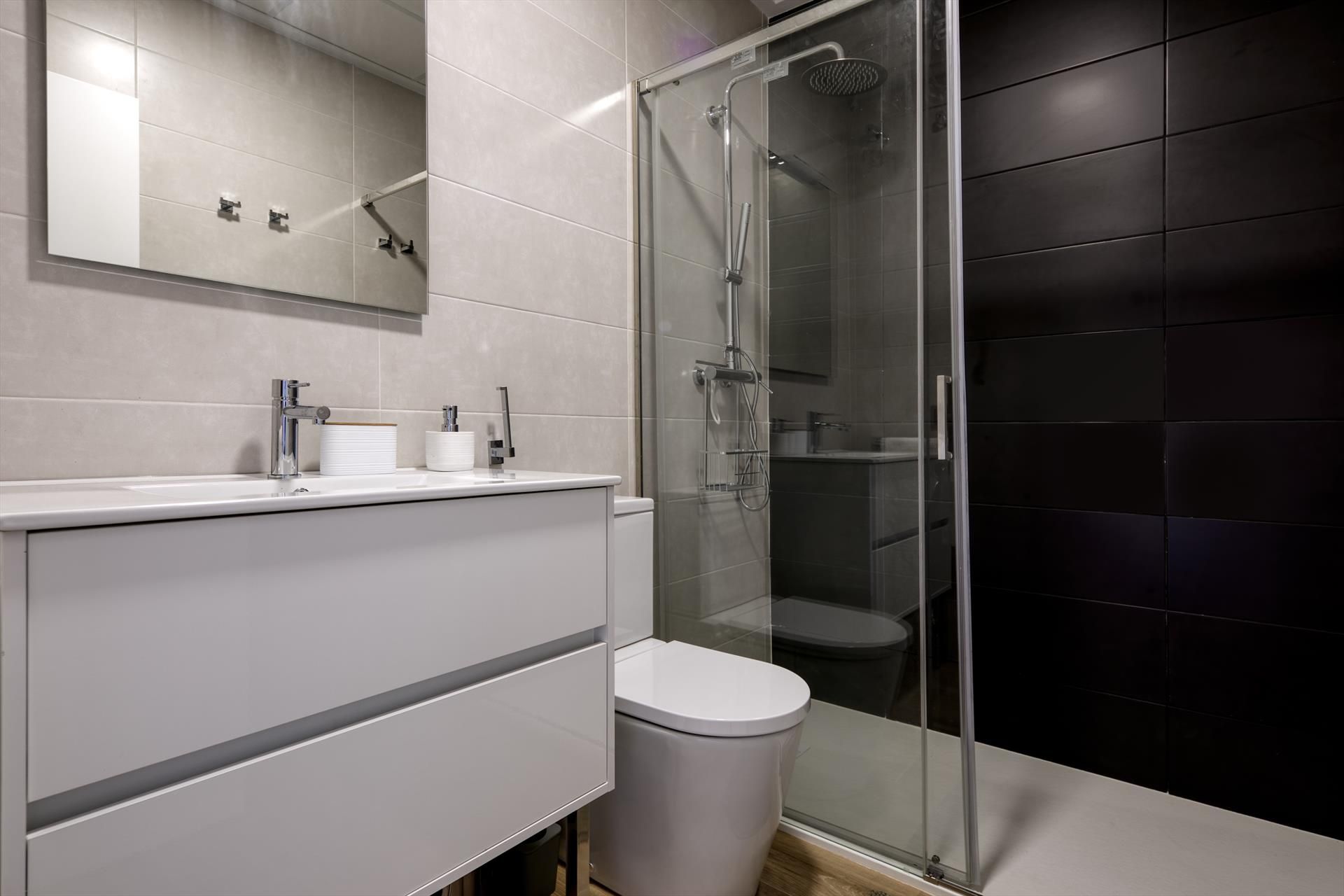 • Bathroom with single sink, shower and toilet