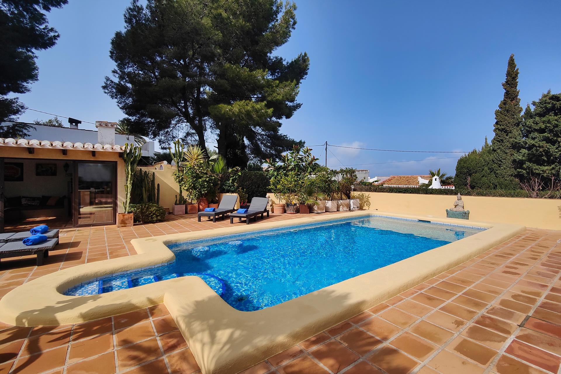 Villa Marco is a cosy, one level holiday home villa with private pool, suited for 4 people in Denia. The outside area with stunning views to the coast of Denia and its surroundings make this holiday villa special. The outdoor area is offering a lot of cosy corners and places to sunbath, relax and sitting together. A separate patio with outside kitchen and al fresco dining, also as a pavilion with comfortable matrasses and cushions are worth to mention extra. The interior of the villa is colourful and very comfortable and offers you all appliances you may need for a perfect holiday in Spain. Such as air conditioning, ceiling fans, completely equipped kitchen, free WIFI, sat-TV and much more. The jacuzzi is private and not usable.