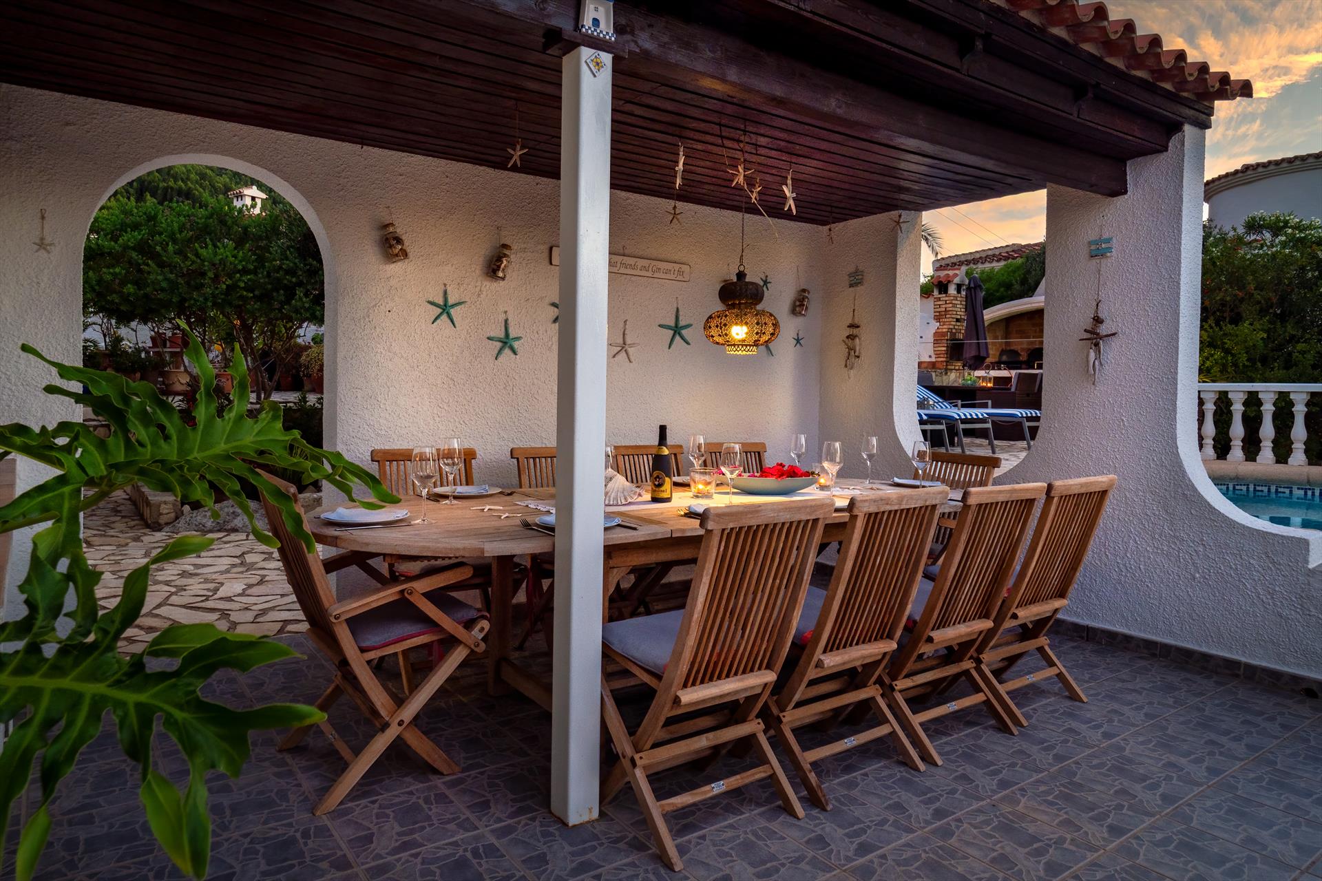 The holiday villa with private pool is furnished personally and with attention to detail. A very special highlight is the oriental chill-out lounge, with comfortable sofas and a wonderful view of the Bay of Denia. Here the holiday can start with a nice glass of wine enjoying the sunset over Denia! Various terraces with sun loungers and seating also offer bigger groups enough space and retreat options to relax and enjoy the Spanish siesta. Another highlight is the huge grill station. The space around the grill station with the chill-out lounge is the perfect summer spot for barbecues and relaxing time with family and friends.