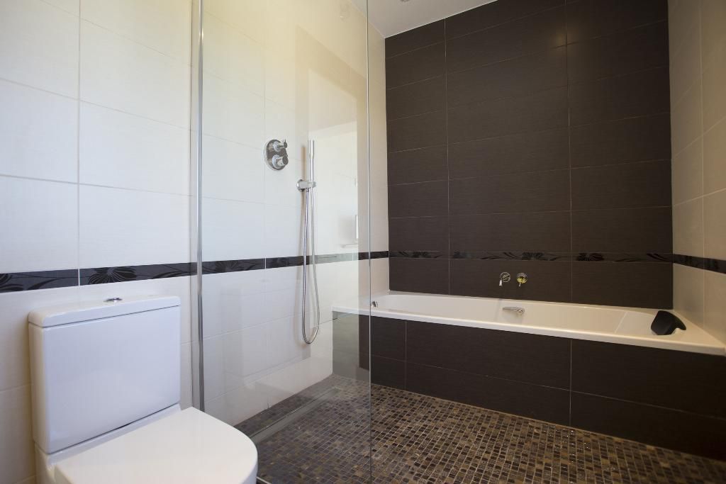 • En-suite bathroom with double washbasin, bath, shower and toilet