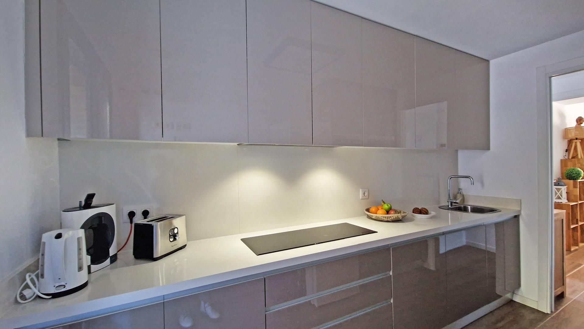 Intérieur : Réfrigérateur, plaque de cuisson et four ou grill électrique, cafetière, grille-pain, bouilloire, fer et table à repasser, mixeur.