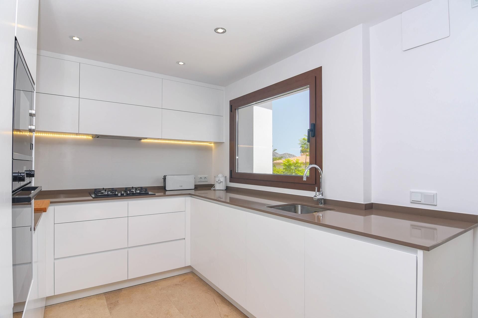 • cuisine ouverte avec plaque de cuisson à gaz, four électrique, micro-ondes, lave-vaisselle, réfrigérateur, congélateur, machine à café, bouilloire électrique, grille-pain et presse-agrumes