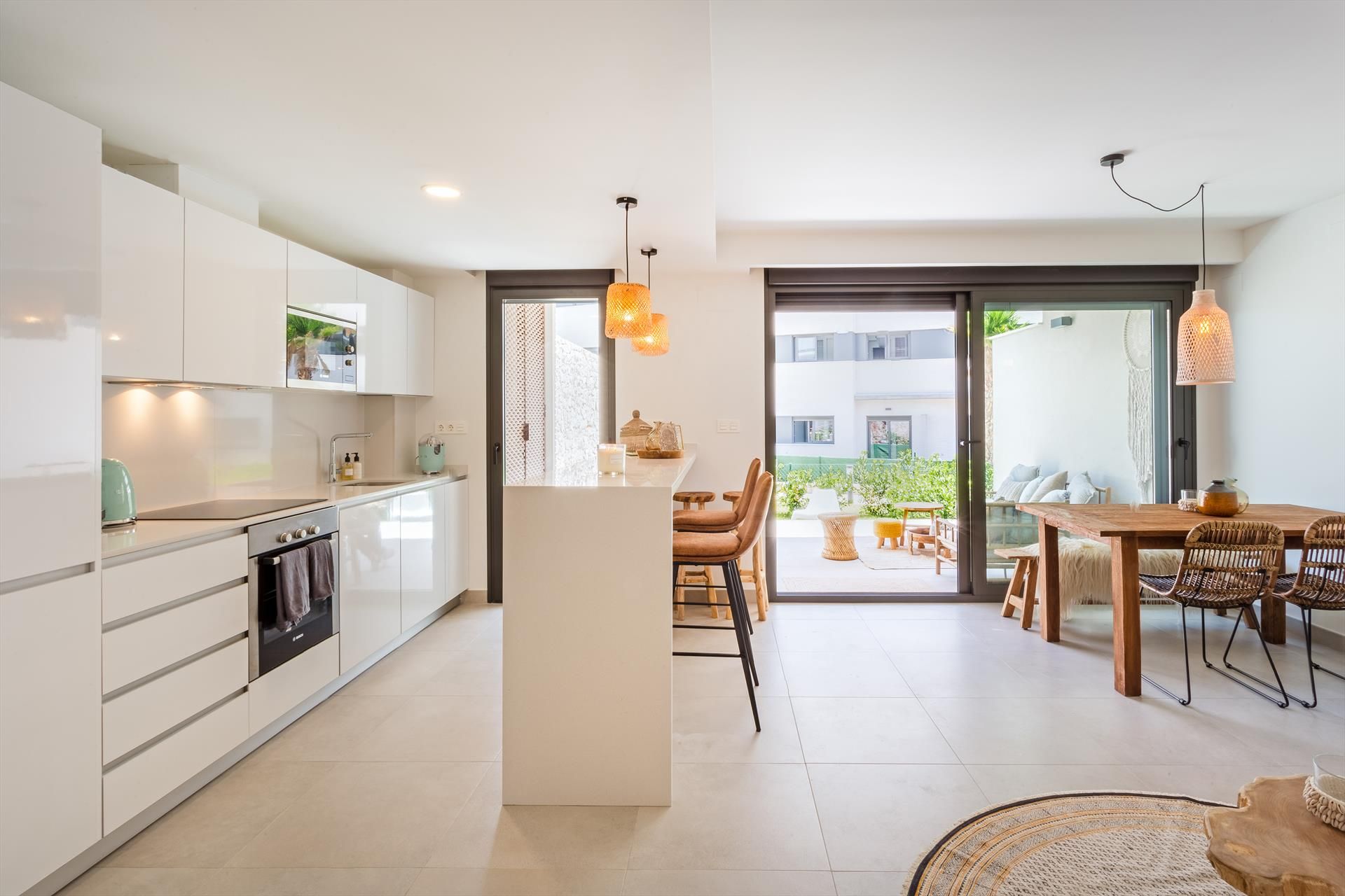 • open keuken met elektrische kookplaat, elektrische oven, magnetron, vaatwasser, koelkast-vriescombinatie, koffiezetapparaat en elektrische waterkoker