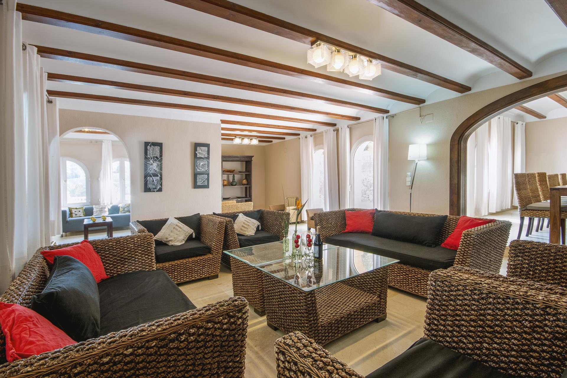 Grote en comfortabele villa in Jávea, Costa Blanca, Spanje met privézwembad voor 20 personen. De woning is gelegen in een residentiële strandomgeving, dicht bij restaurants, bars en supermarkten, 1 km van het strand El Arenal, Jávea en 1 km van Mediterráneo, Jávea.